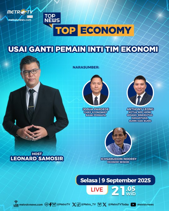 Saksikan TOP ECONOMY dengan tema “USAi GANTi PEMAiN iNTi TiM EKONOMi" bersama host Leonard Samosir pada Selasa, 9 September 2025 (10 Rabiul Awal 1447-H) LiVE pukul 21.05 WiB hanya di METRO TV