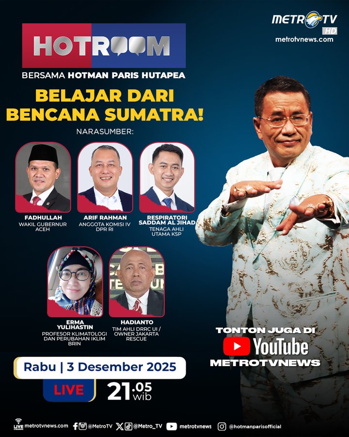 Saksikan #HOTROOMMETROTV "BELAJAR DARi BENCANA SUMATRA!" Edisi Rabu, 3 Desember 2025 (13 Jumadil Akhir 1447 Hijriyah) pukul 21.05 WiB di #MetroTV